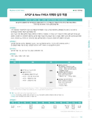 | 선수과정 | APQP(사전제품 품질계획) 이해와 실무 적용(P.131), New FMEA(잠재적 고장형태 및 영향분석) 이해와 실무 적용(P.132) 경영일반