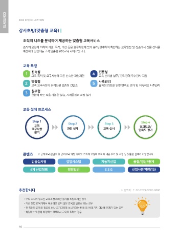 콘텐츠 ※ 공개교육 콘텐츠 및 공개교육 과정 외에도 조직의 요청에 의하여 내용 추가 및 수정 등 맞춤형 설계가 가능합니다.