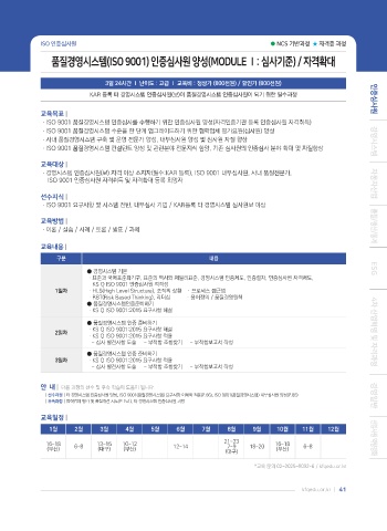 | 선수과정 | 타 경영시스템 인증심사원 양성, ISO 9001(품질경영시스템) 요구사항 이해와 적용(P.66), ISO 9001(품질경영시스템) 내부심사원 양성(P.68) 경영일반