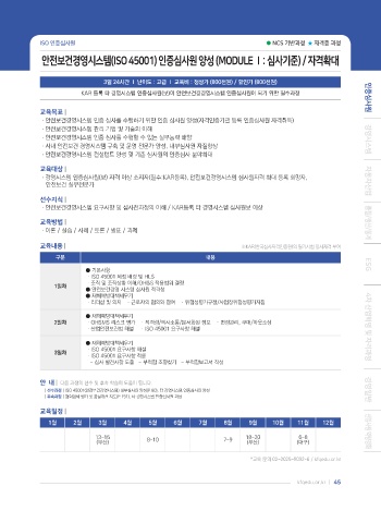 | 선수과정 | ISO 45001(안전보건경영시스템) 내부심사원 양성(P.80), 타 경영시스템 인증심사원 양성 경영일반