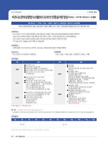 | 선수과정 | ISO 22301(비즈니스연속성경영시스템) 추진실무 및 내부심사원 양성(P.100) | 후속과정 | 협력업체 평가 및 품질개선 지도(P.151), 타 경영시스템 인증심사원 과정
