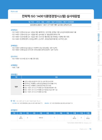 | 선수과정 | ISO 14001(환경경영시스템) 요구사항 이해와 적용(P.72) | 후속과정 | ISO 14001(환경경영시스템) 내부심사원 양성(P.74) 경영일반