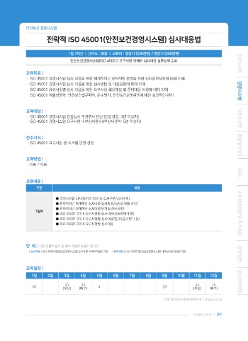 | 선수과정 | ISO 45001(안전보건경영시스템) 요구사항 이해와 적용(P.78) | 후속과정 | ISO 45001(안전보건경영시스템) 내부심사원 양성(P.80) 경영일반