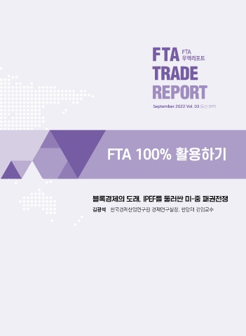 FTA 무역리포트 September 2022 Vol. 03 (통권 39호) FTA 100% 활용하기 블록경제의 도래, IPEF를 둘러싼 미-중 패권전쟁 김광석 한국경제산업연구원 경제연구실장, 한양대 겸임교수