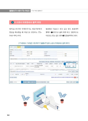 활용하기 쉬운 FTA-PASS FTA-PASS 활용하기 1 -3 소명서·자재명세서 출력 방법 원재료소명서와 자재명세서는 원산지증명서 물품별로 다운로드 받고 싶은 경우, 물품내역 발급을 완료했을 때 자동으로 생성되는 FTA- 탭에서 1단건으로 출력 하면 되고, 일괄적으로 PASS 서비스이다. 다운로드 받고 싶은 경우 2일괄출력하면 된다. [ FTA증명서 기관발급 신청 화면 中 물품내역 탭의 소명서자재명세서 출력 화면 ] 162