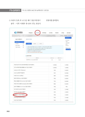 FTA EXPERTS FTA 원산지증명서 발급 절차 습득을 통한 수출 증대 ① 사용자 등록 후 로그인 해서 원산지증명서 증명서를 클릭한다. 클릭 - 이후 아래쪽 한-중국 FTA 원산지 062