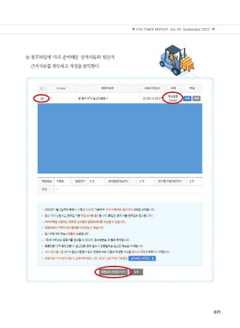 FTA TRADE REPORT Vol. 03 September 2022 ⑫ 첨부파일에 미리 준비해둔 선적서류와 원산지 근거서류를 첨부하고 저장을 클릭한다. 071