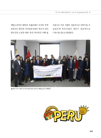 FTA TRADE REPORT Vol. 03 September 2022 개발도상국인 페루의 수출증대의 의지와 무역 수용으로 이번 사업이 성공적으로 이루어질 수 선진국인 한국의 지식공유사업이 하나가 되어 있었으며 후속사업의 제안이 성공적으로 연구진의 노력과 페루 측의 적극적인 이해 및 이루어질 것으로 예상한다. ▲ 페루 KSP 수행단과 페루 통상관광부 실무진 최종보고회 단체촬영 091
