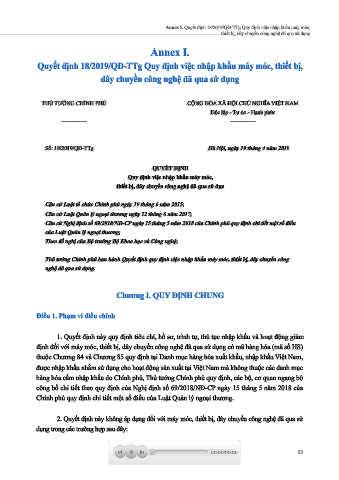 Annex I. Quyết định 18/2019/QĐ-TTg Quy định việc nhập khẩu máy móc,