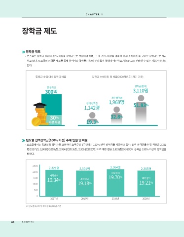 명(2017년), 2,301명(2018년), 2,364명(2019년), 2,305명(2020년)으로 매년 평균 2,323명(19.36%)이 등록금 100% 이상의 장학금을