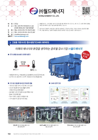 대 표 ㅣ 류 진 상 ㈜월드에너지는 지역 냉방용 저온수2단 흡수냉동기를 비롯하여 온수, 증기가스, 배기가스 등 다양한 종류의 열원을