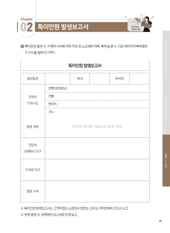 ❶ 최초 발견 직원은 침착하게 상황을 관찰한다. 먼저 상황이 안전한지 확인한다. 특이민원 발생 시, 아래의 서식에 따라 작성 및 보고해야 하며, 폭력 발생 시, 다음 페이지의‘폭력행위