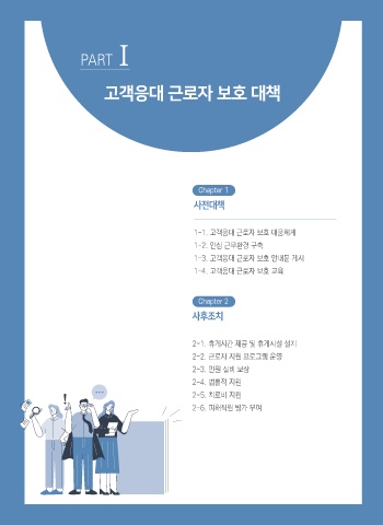 PARTⅠ 고객응대 근로자 보호 대책 Chapter 1 사전대책 1-1. 고객응대 근로자 보호 대응체계 1-2. 안심 근무환경 구축 1-3. 고객응대 근로자 보호 안내문 게시 1-4. 고객응대 근로자 보호 교육 Chapter 2 사후조치 2-1. 휴게시간 제공 및 휴게시설 설치 2-2. 근로자 지원 프로그램 운영 2-3. 민원 실비 보상 2-4. 법률적 지원 2-5. 치료비 지원 2-6. 피해직원 병가 부여