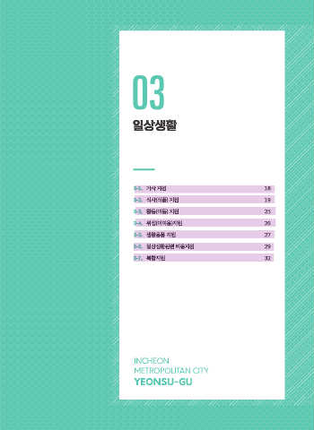 03 일상생활 3-1. 가사 지원 18 3-2. 식사(식품) 지원 19 3-3. 활동(이동) 지원 25 3-4. 위생(이미용)지원 26 3-5. 생활용품 지원 27 3-6. 일상생활관련 비용지원 29 3-7. 복합지원 32 INCHEON METROPOLITAN CITY YEONSU-GU