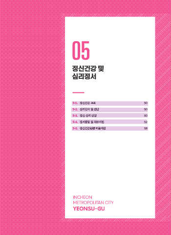 05 정신건강 및 심리정서 5-1. 정신건강 교육 50 5-2. 심리검사 및 진단 50 5-3. 정신·심리 상담 50 5-4. 정서발달 및 치유지원 52 5-5. 정신건강관련 비용지원 58 INCHEON METROPOLITAN CITY YEONSU-GU