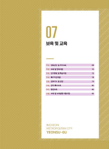 07 보육 및 교육 7-1. 양육상담 및 부모교육 68 7-2. 보육 및 양육지원 70 7-3. 인지발달 및 학습지원 72 7-4. 특기적성지원 78 7-5. 진로지도 및 상담 79 7-6. 장애·특수교육 80 7-7. 평생교육 80 7-8. 보육 및 교육관련 비용지원 83 INCHEON METROPOLITAN CITY YEONSU-GU